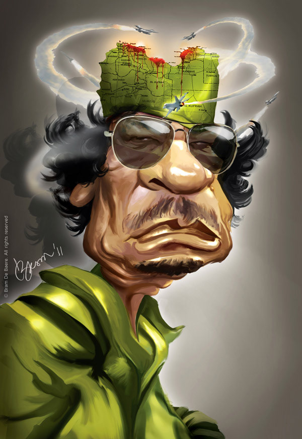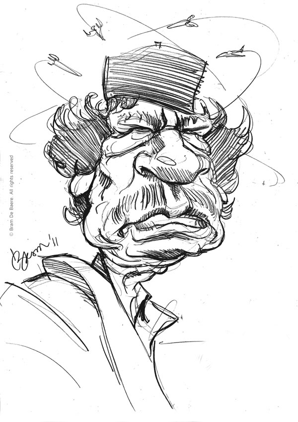 cartoon for Knack magazine, 2011 former Libyan dictator Muammar Gaddafi fighting a bloody war against insurgents